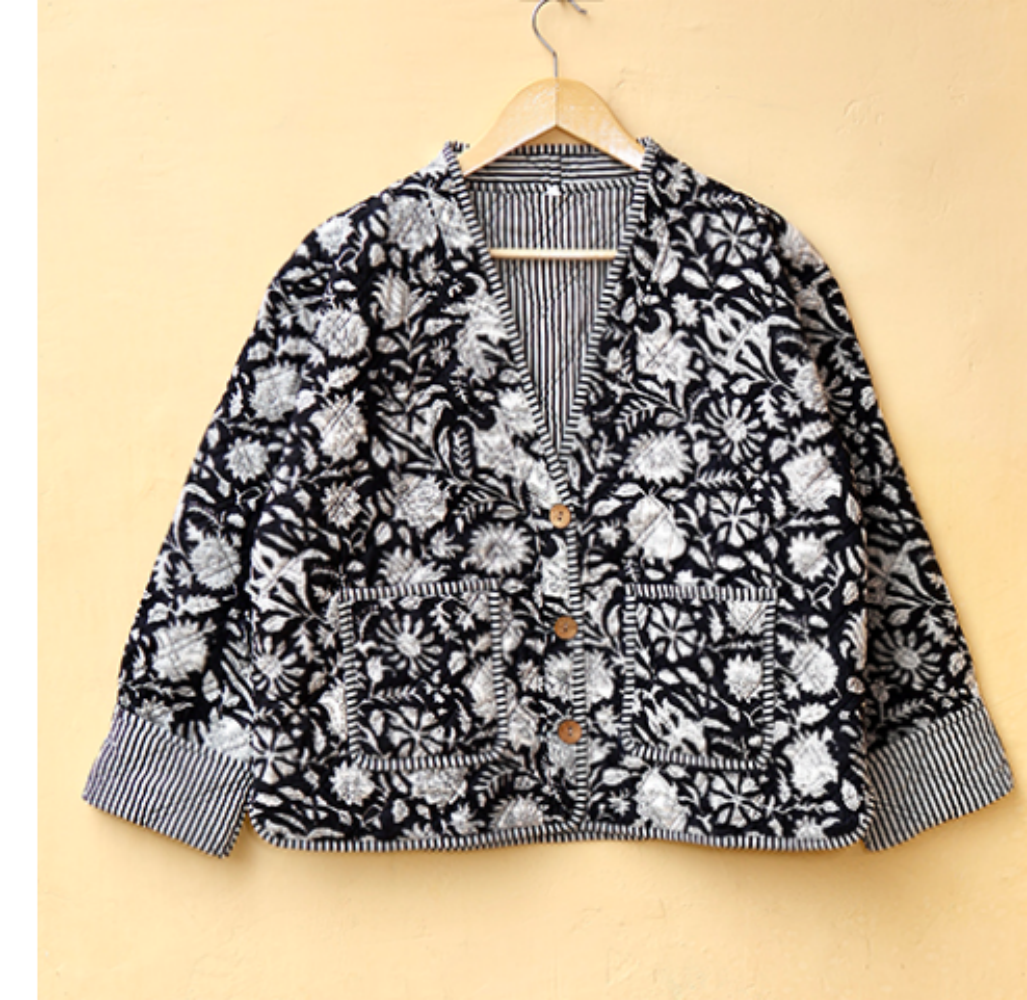 A: The jacket has a traditional hand block print design with beautiful embroidered patterns.Q: Is the jacket suitable for winter?